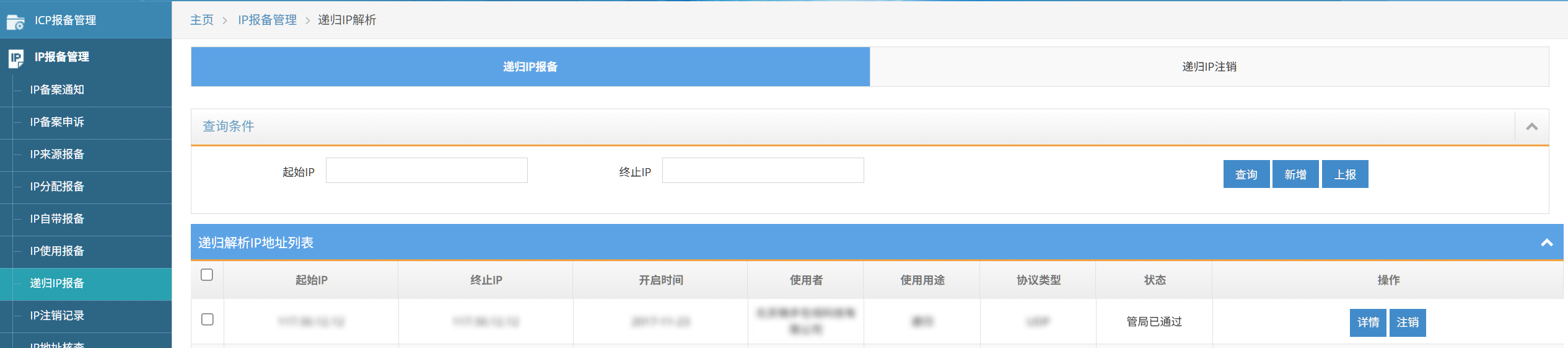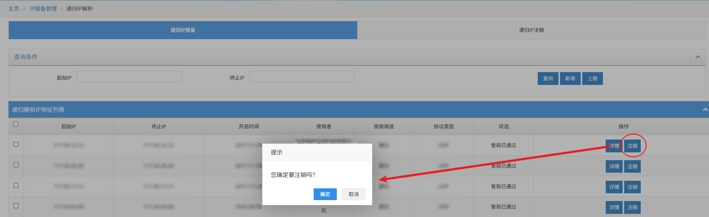 删除报备—点击【注销】按钮,对已上报的递归解析IP数据进行注销删除操作,如若当前已报备递归解析IP中有需要进行调整的内容也可以通过先注销后 新增的操作进行内容变更。