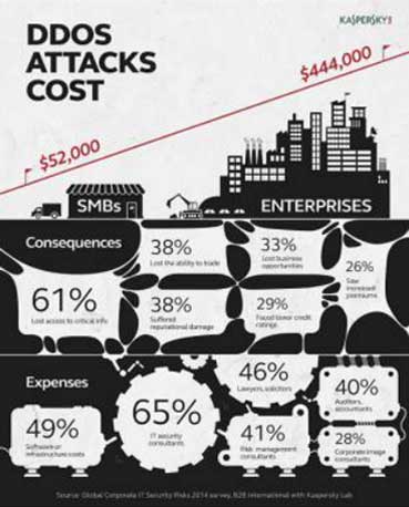 根据卡巴斯基2016Q3的调查报告,DDoS攻击造成61%的公司无法访问其关键业务信息,38%公司无法访问其关键业务,33%的受害者因此有商业合同或者合同上的损失。